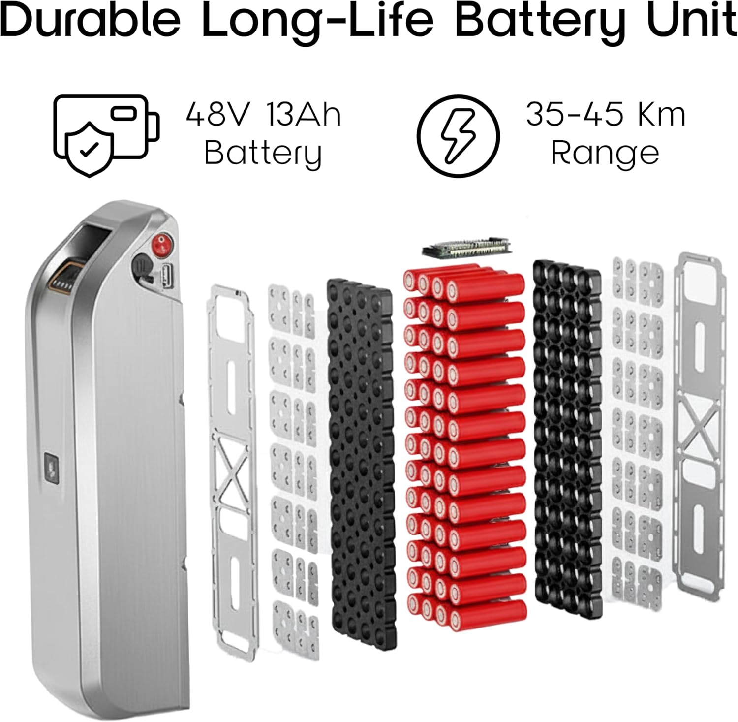 • 48V 13Ah Lithium Battery: Long-lasting battery offering up to 45Km range per charge.